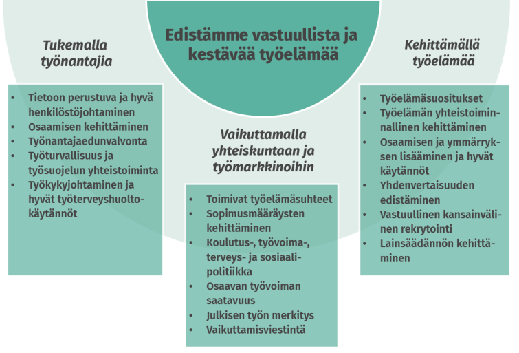 Kehitämme työelämää yhteistoiminnallisesti ammattiliittojen kanssa kestävän työelämän periaatteita noudattaen; Tarjoamme palveluita ja toteutamme hankkeita työyhteisöjen työelämän laadun ja tuottavuuden parantamiseen.