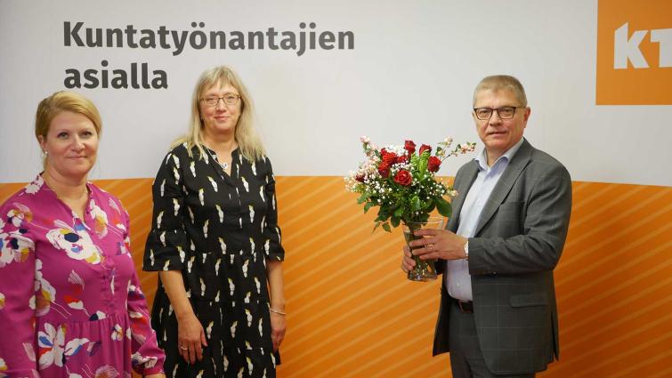 KT:s delegation gratulerade arbetsmarknadsdirektör Markku Jalonen under mötet som hölls måndagen den 7 september. Delegationens ordförande Kirsi-Marja Lievonen framförde gratulationerna på hela delegationens vägnar och tackade Jalonen för hans långsiktiga arbete inom intressebevakningen. Kommunförbundets vice verkställande direktör Timo Reina framförde ledningens lyckönskningar och tack för ett viktigt och krävande arbete.